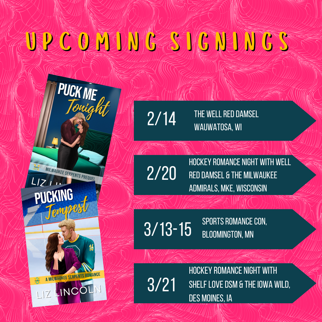 February 20—Hockey Romance Night with The Well Red Damsel and the Milwaukee Admirals. Join me and 11 other hockey romance authors for a signing before the game, then watch the Admirals take on the Texas Stars. Unfortunately this event is sold out and tickets are required. If you have tickets already, you can preorder my books here to make sure you get a copy.